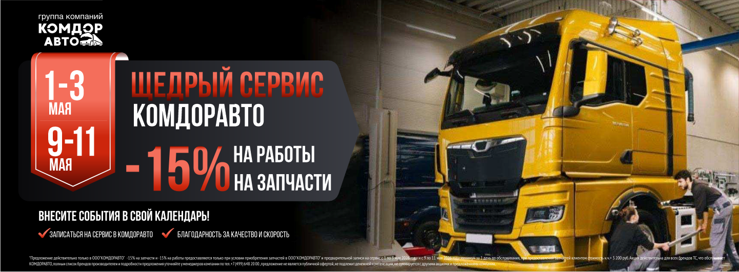 *Предложение действительно только в ООО»КОМДОРАВТО» -15% на запчасти и -15% на работы предоставляются только при условии приобретения запчастей в ООО»КОМДОРАВТО» и предварительной записи на сервис с 1 по 3 мая 2026 года и с 9 по 11 мая 2026 года минимум за 1 день до обслуживания, при предоставлении запчастей клиентом стоимость н.ч.= 3 200 руб. Акция действительна для всех брендов ТС, что обслуживает КОМДОРАВТО, полныи список брендов производителеи и подробности предложения уточняйте у менеджеров компании по тел. +7 (499) 648 20 00 , предложение не является публичной офертой, не подлежит денежной компенсации, не суммируется с другими акциями и предложениями компании.